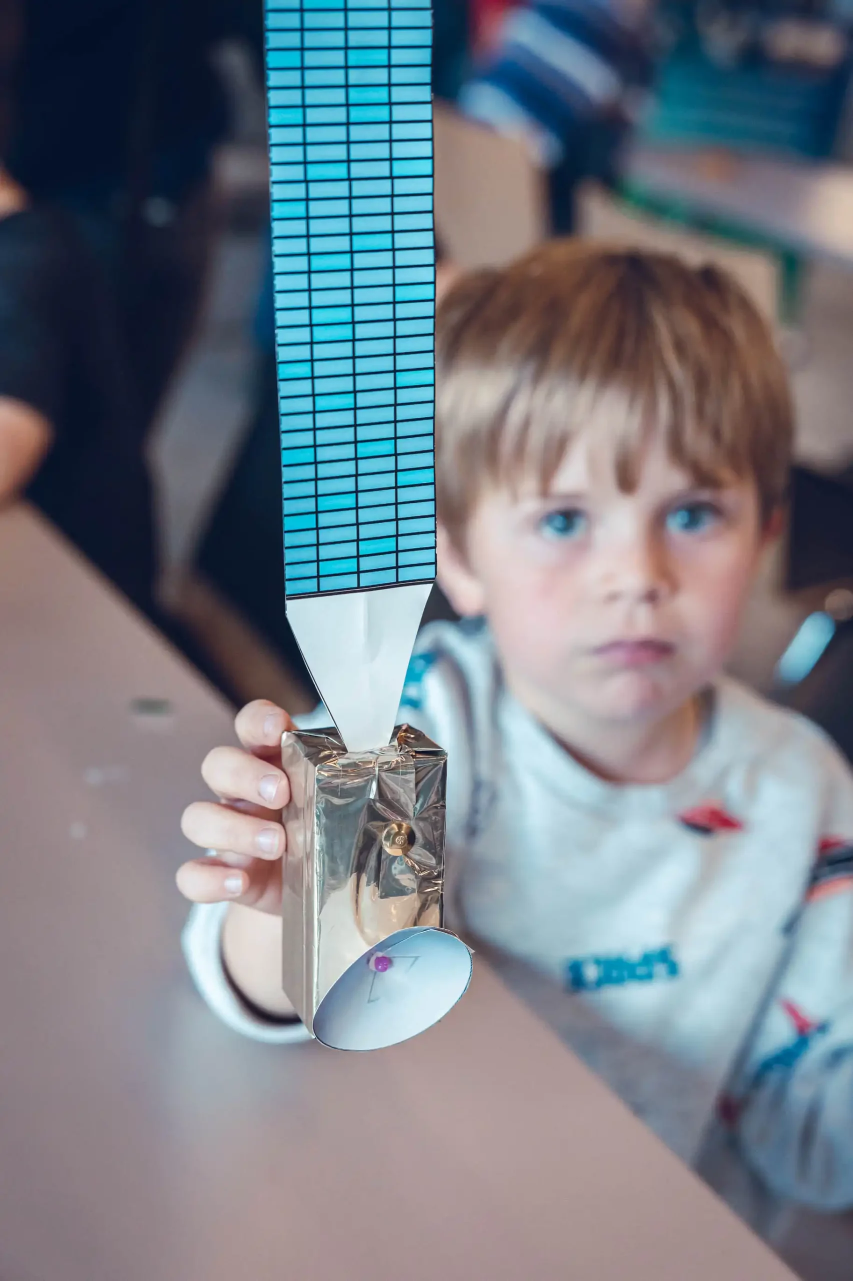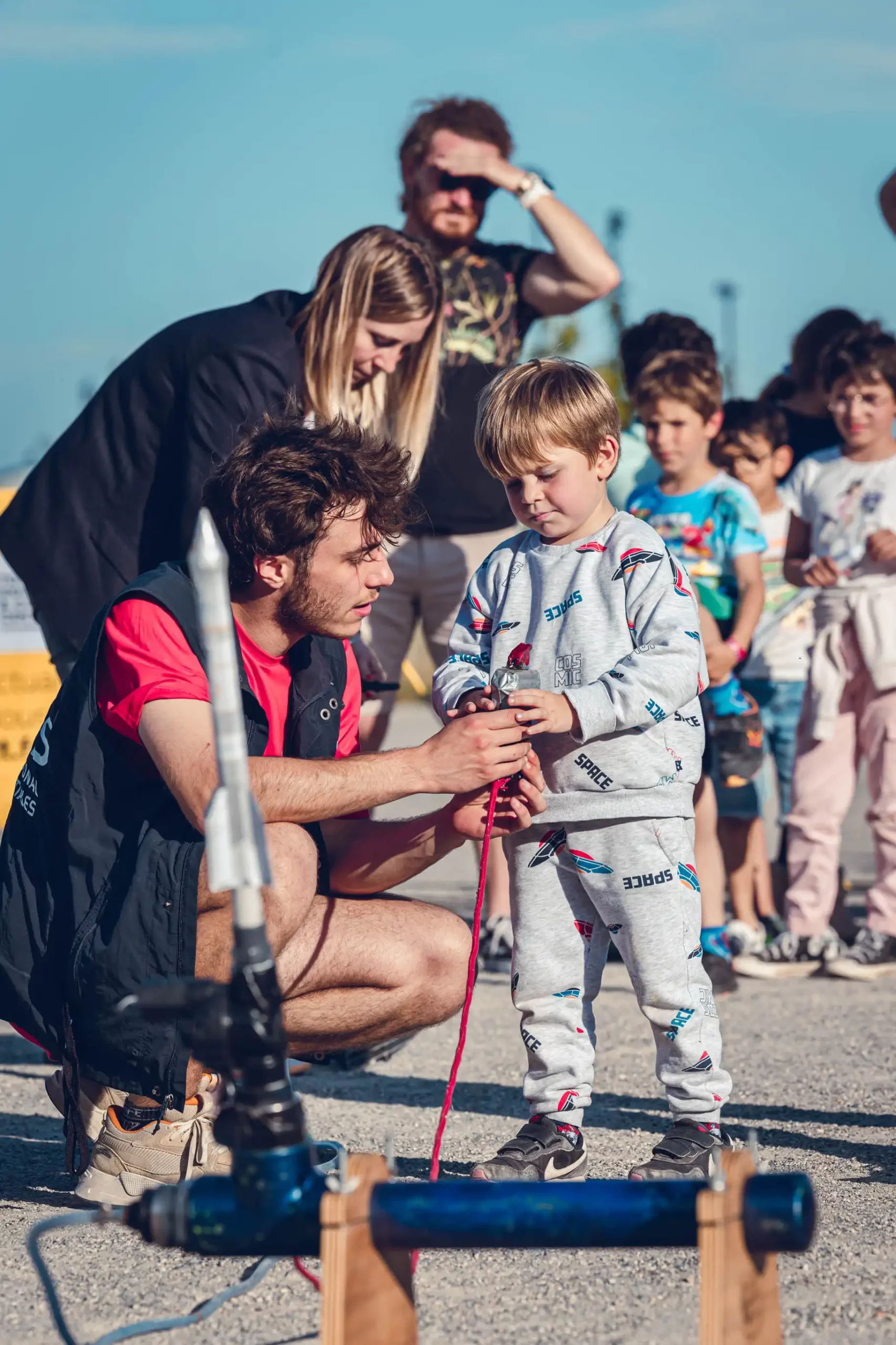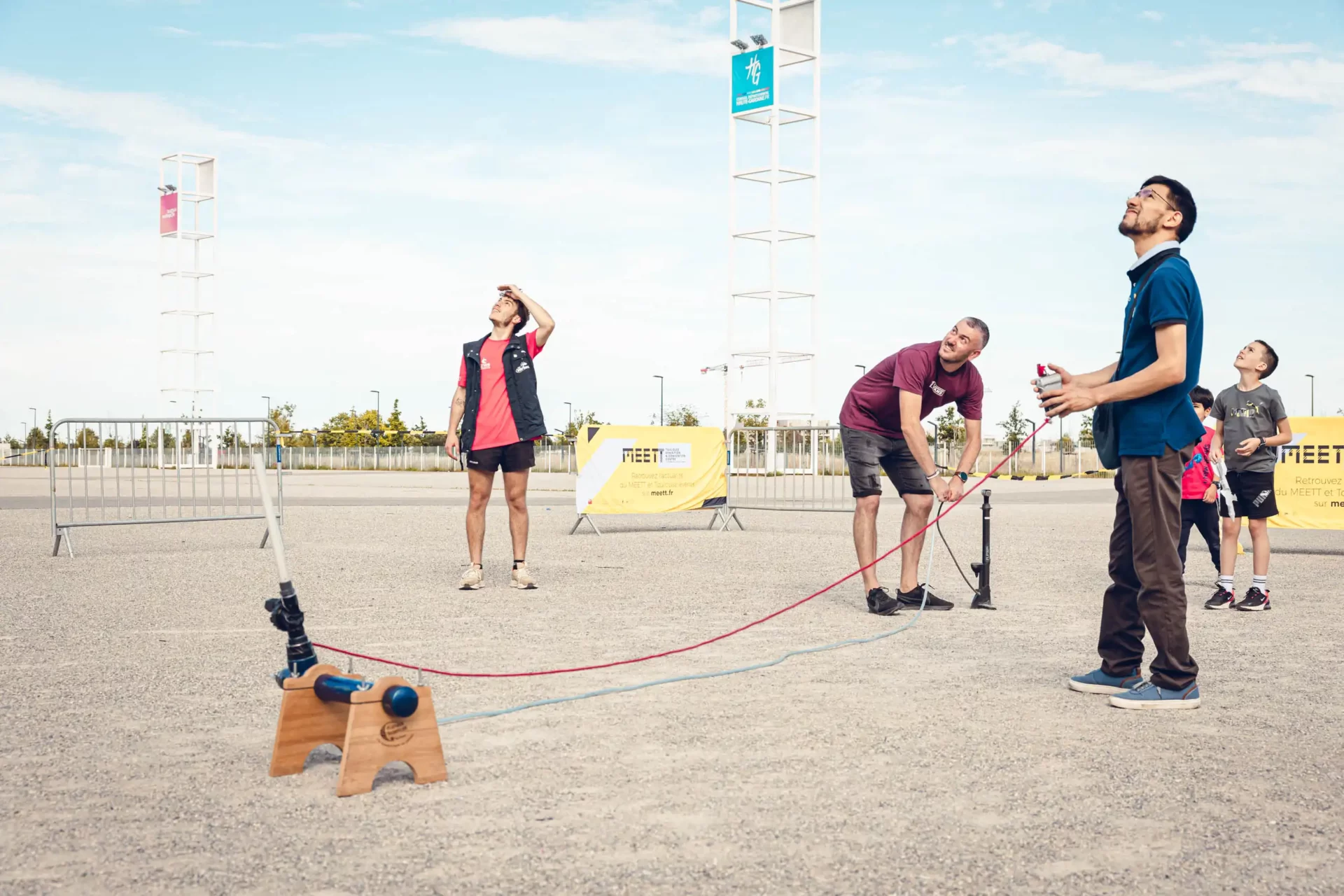 Les jeunes construisent et expérimentent afin de découvrir et de comprendre le système de propulsion des lanceurs. En duo, ils réalisent une fusée à air, à partir de papier cartonné. Ils vont ensuite l’envoyer dans le ciel grâce à un lanceur pneumatique.